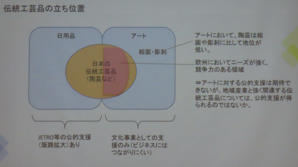 二宮参事官は、陶芸など日本の伝統工芸品の欧州における立ち位置が、ニーズが強く、競争力のある領域であることを強調。伝統工芸品の販路拡大に成功するための条件として、日本側ではやる気のある広域の推進母体によるノウハウの蓄積、各地域ではやるきのある首長や市役所職員、地元経済界、若手作家・職人らによる営業チームの機能、海外市場に向けては地域横断的な人的ネットワークなど、小粒なニーズをつなぎ合わせる取り組みの必要性を訴えた。