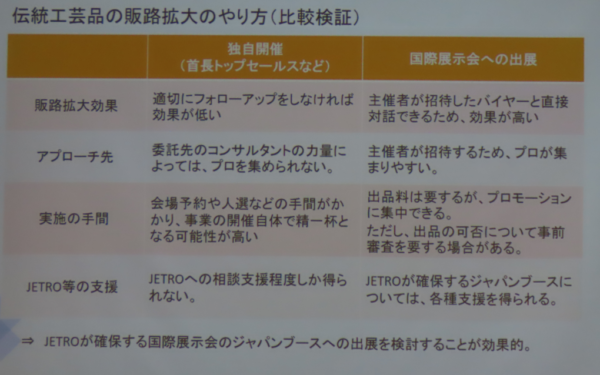 伝統工芸品の販路拡大の手法としては、国際展示会への出展を紹介。バイヤーと直接対話や、出品料は要するがプロモーションに集中できたり、JETROが確保するジャパンブースで各種支援が得られることなどを利点として紹介した。一方、独自開催(首長トップセールス)については、膨大な手間や委託先のコンサルタントの力量による成功可否、フォローアップの大変さなどを挙げた。