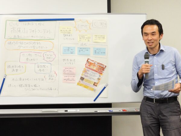最後に発表した班は、高尾山を題材に、親子三世代で楽しめるユニバーサルツアーを検討。「アクセシブル」や「ユニバーサル」という言葉を前面に出すのではなく、「じいじ・ばあばと行く高尾山」といった分かりやすい切り口で訴求し、裏側で必要なサポートを用意する発想を示した。