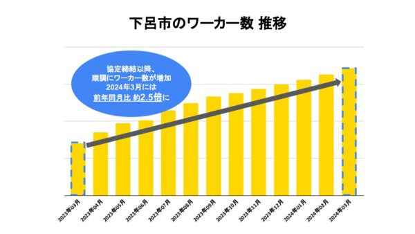 協定締結から1年間で下呂市内のワーカー数はもちろん、事業所数、募集人数も順調に伸⻑している。2024年3月時点にはワーカー数が前年同月比約2.5倍、事業所数が前年同月比約4.4倍、求人の募集人数は約27.3倍となっている。特に宿泊業や飲食業、農業やスーパーにおいてタイミーが活用されており、スキマバイトの働き手が市内の人手不足解消の一助を担っている。2023年8月に開催された下呂温泉まつりでの会場内のゴミ拾いの仕事や、牧場に放たれた牛を山の上から牛舎に返す下牧作業の仕事などでもタイミーが活用されている。