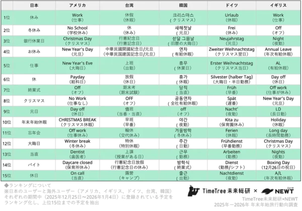 一方、アメリカやイギリスでは「Work(仕事)」が1位となり、年末年始も通常稼働する社会構造が反映された。イギリスでは「Boxing Day(12月26日)」、ドイツでは「Zweiter Weihnachtstag(クリスマス翌日)」といった祝日文化の違いも見られた。台湾や韓国では期末試験や終業式といった教育制度由来の予定が上位に入り、各国の生活文化の差異が鮮明に表れた。