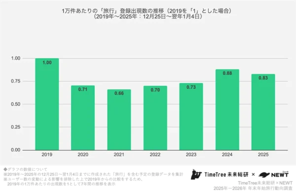 TimeTree未来総研と令和トラベルが運営する旅行アプリNEWTはこのほど、2025年から2026年にかけての年末年始(12月25日〜1月4日)の旅行動向に関する共同調査結果を発表した。世界6カ国の「予定データ」とNEWTの「予約データ」を組み合わせた分析から、日本人の年末年始旅行がコロナ前比83%まで回復した一方で、物価高や円安の影響で伸びが鈍化し、需要が踊り場に差しかかっている実態を浮き彫りに。2025年の年末年始に登録された「旅行」予定は2019年比で83%に達し、2023年の73%、2024年の88%と回復傾向を辿ってきたものの、前年より5ポイント減少し、宿泊費の上昇や物価高による家計への圧迫が旅行需要の伸びを鈍化させていることが明らかになった。
