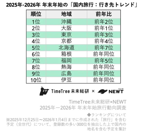 また、北海道は前年7位から5位に浮上。箱根(6位)、熱海(8位)、伊豆(10位)といった温泉地も上位に入り、「遠出を控えつつ、国内でゆったり過ごす」年末年始スタイルの広がりが見て取れる。