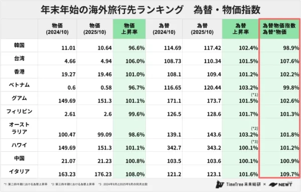 4位のベトナムも、依然として物価上昇が緩やかで、為替物価指数が100%を下回る〝おトクな海外〟としての位置付けを維持。一方、人気の高い香港や、欧州で唯一ランクインしたイタリアは、為替と物価の上昇により割高感が強まっている。ただし、ツアー内容や宿泊グレードの調整次第では、十分に選択肢となり得ると分析している。